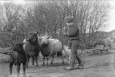 Kolbäck sn, Herrevad. Man står kedjad vid träd och drar i kedjan. "Handklove med kedja fastsatt i ett trä.