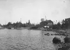 FKI:s klubbhus på Måsholmen i Lilla Värtan under byggnad. I förgrunden en kanot liggande vid bryggan.