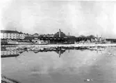 Bäckefors bruk. Bruket från början i öster. Till höger utmed fallen ligger först en förrådsbyggnad sedan gamla brygghuset, ankarsmedjan och metallverkstaden. Det långa taket framför kullen tillhör ett kolskjul framför vilket Spiksmebynninga synes. På kullen mitt för ankarsmedjan ligga Herrgårdsbynninga och två arbetarbostäder varav gavelhuset till vänster är Engelska bynninga. Längre till vänster skymtar taken på ladugården och lador.