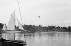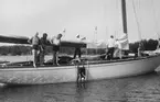 Tre män i en båt under KSSS:s långfärdssegling genom Södermanlands och Östergötlands skärgårdar i juli 1932. I mitten Gunnar Rooth, i aktern David Öhman, i fören oidentifierad person, i bakgrunden Erik Åkerlunds motoryacht STELLA MARINA.