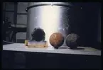 Dokumentation av stenkuletillverkningen. Stenkulorna måste kontrolleras hela tiden. Här är dom så kulämnen som bygger på ett rappsfrö. Detta kulämne får torka tills det är dags att gör en färdig kula.