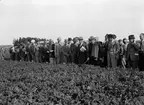 "Bättre rödklöverstammar - bort med ogräset, motto på Ultunakurs" - kursdeltagare studerar klöverodling, Lantbrukshögskolan, Ultuna, Uppsala juli 1942