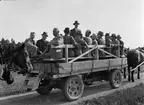 "Bättre rödklöverstammar - bort med ogräset, motto på Ultunakurs", kursdeltagare åker hästdragen gummihjulsvagn, Lantbrukshögskolan, Ultuna, Uppsala juli 1942