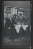 "Kyrkvaktare Pettersson, Gryt" Porträtt av en man som sitter vid ett bord med gratulations-blommor.