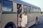 Resenärer vid långfärdsbussar dagen före julafton. Två kvinnor med bagage och vintersportutrustning.