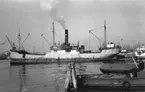 Foto i svartvitt visande lastångfartyget "NILS GORTHON" av Helsingborg i Köpenhamn under 1930-talet.