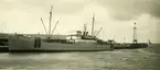 Lastfartyget JOHN ERIKSON vid sluss i Sjötorp längs Göta kanal. I bakgrunden en ledfyr.