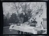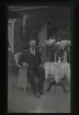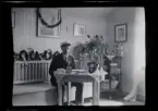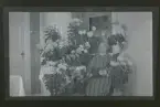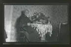 "Far 70 år." Porträtt av Fredrik Vilhelm Eriksson som sitter vid ett bord fullt av gratulations-blommor.