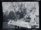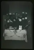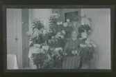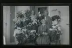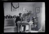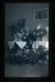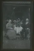 "Far och Mor." Porträtt av Fredrik Vilhelm Eriksson (f.1854) och Anna Maria Larsdotter (f.1856) som sitter vid ett bord fullt av gratulations-blommor.