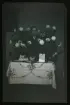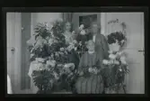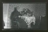 "Anna Jansson, Roshill, Äsköping." En kvinna som sitter vid ett bord med gratulations-blommor.
