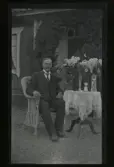 "F.d. kusken Larsson, Fogelstad." Porträtt av en man som sitter med gratulations-blommor omkring sig.