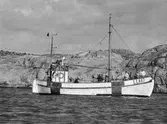 Fiskebåten LL 667 ASTA AV SMÖGEN. I bakgrunden en ledfyr på en klippa.