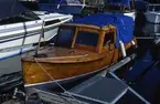 Båten "Trollungen I", läckerhet i Honduras-mahogny, ute på seglats, med rorsman Helge Stenmark och gast Stellan i båten. Sjöbodar och hus i bakgrunden på land.