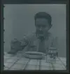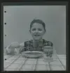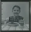 Skolchef Per Thorstensson visar skolan för blivande elever. Barnen kommer från lekskolan. Ett besök i skolbespisningen ingår. Barnen sitter vid flera bord och äter. De har mjölk i glasen.