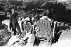 Robin, Fred och Alexandra går med en matvagn i korridoren vid Lunkentussen, Katrinebergs daghem, 1992-93.