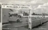 Skummeslövsstrand. Åstrands minigolfbana. Människor som spelar minigolf. Väderkvarn, svenska flaggan, trädgårdsmöbler.