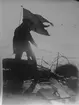 Reproduktion av två bilder som dokumenterar minröjning till havs. På första bilden flyter en mina på vattenytan. På andra bilden närmar sig en roddbåt med tre sjömän minan. En man i akter försöker få tag på den.