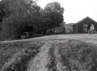 Lantgård i Förlanda med bostadshus och ekonomibyggnader. I förgrunden en mjölkpall, där mjölkbilen hämtade upp bondens mjölkkannor.