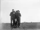 Tre pojkar vid ett mjölkbord, där en står på det och lyfter upp den mindre. I bakgrunden skymtar ett hus med tomten hägnad av häck och stengärdsgård. Bilden är troligen tagen i Gällared eller Okome.