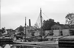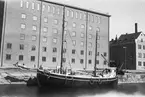 Öland, Borgholm. Parti av hamnen med spannmålssilo och motorseglare.