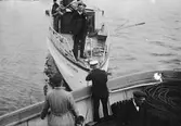 De båda männen t v är, liksom båten, oidentifierade. T h ses med cigarett och KSSS-mössa Evert Taube.