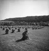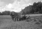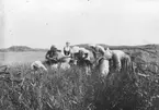 Enligt text som medföljde bilden: Anne Lyzell, Aågot Stub, Valter Lycke vid en sädesskyl. 6/8 1899 Fiskebäck.