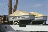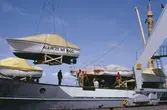 Albin-båtar lastade på fraktfartyg. Hängade i luften: Albin 25 nummer 1000.