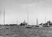 Från Nyländska Jaktklubbens jubileumsregatta 1961; KSSS-eskadern på väg in mot Helsingfors. NJK:s klubbhus på Blekholmen i ö h bildfält.