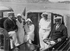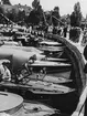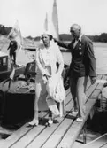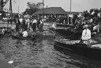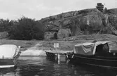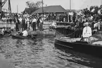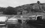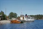 Motorbåt och folkbåten KARP på väg genom Väddö kanal.