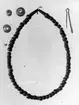 'Bilder till monter 254 med pärlhantering, i basutställningen. Tillverkning av pärlhalsband. :: :: En person sitter med pincett och lägger pärlor i rader.'