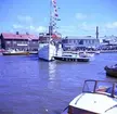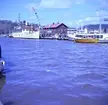 Göteborgs hamn 1940. Hamnpolisens patrullbåt går in till sin förtöjningsplats vid kajen nedanför elverket. Fil lic Gunnar Jonssons undersökningsresa till Västkusten juni 1940.