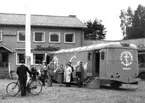 "Porslinsbussen" från Gustavsberg parkerad utan för Folkets Hus i Ljungaverk, Ånge kommun. Två damer studerar utbudet.