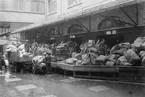 Prydligt lager av postpåsar i påskällaren på Stockholm Ban. Lagret av våra postpåsar beräknas f.n. till omkring 5 miljoner kronor. Det lagret är vår dyraste förbrukningsartikel.
