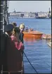 Bilden visar kronprinsessan Louise med en amiral ombord på pansarskepp Sverige. I bakgrunden syns Kastellholmen där ett större antal örlogsfartyg ligger förtöjd.