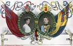 Bilden visar kronprinsessan Louise och kronprins Gustav i samtal med en amiral och befäl ombord på pansarskepp Sverige. I bakgrunden syns övningsfartyget af Chapman med storflaggning.