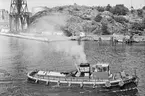 Tegelbacken. En ung glassförsäljare äter glass, med en glasslåda från Glace-Bolaget (GB) på magen. Centralpalatset i bakgrunden.