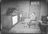 Man (äldre) och kvinna som beskådar en radiogrammofon.