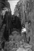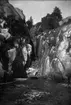 Fotografi från expedition till Peru 1920. Motiv av man på häst ovanför en brant ravin i djungeln.