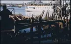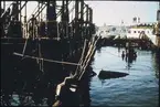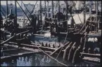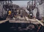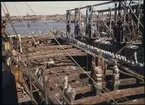 Vasas övredäcks balkar. Inplastade relingsstöttor och knektar för att skydda träet från uttorkning.