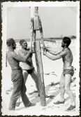"Ribersborg" Tre mannar håller på att slå ner stängselstolpar på stranden.