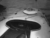 Visar repförstärkningarna i liken samt segelsäckar för fock och storsegel till Petterssonbåten WIKING X i Båthall II.