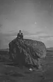 "Jättesten på Rossö. Jättestenen ligger ensam på sluttningen mot sjön. Varför den har fått detta namn beror på en gammal sägen om jätten Rossö. Det var nämligen två jättar som bodde på var sin sida om sundet och en vacker dag så kommo de i luven på varandra och det slutade med att de kastade sten över sundet. Denna sten, är som det heter, kastad rätt över sundet och som det synes rätt så långt upp på land. Det lustiga med historien är att precis rätt över sundet ligger en sten lika ensam som denna och ungefär lika stor, så att den eller de som har satt ihop denna historia tycks nog ha demonstrerat den rätt så bra. Dessa stenar har narturligtvis blivit flyttade av isen när Sveriges skridjökel gick fram. Här har jag emellertid krånglat mig upp och satt mig på stenen när min kamrat tog filmen."