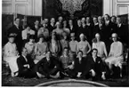 En "sällskapsafton" med Föreningen Kvinnans Politiska Rösträtt (FKPR), i Hotell Brahes stora sal, Gränna. 16 kvinnor klädda som historiska personer. Stående fr vänster: friherrinnan Marna von Rosen - Drottning Margareta, fröken Ebba Carlsson - Kristina Gyllenstierna, fru Ebba Ström - Sigrid Storråda, fru Berta Bergin - Heliga Birgitta, fröken Agnes von Rosen - Margareta Ascheberg-Barnekow, fru Maria Jansson - nutidskvinna, fröken Sigrid Jansson - Sidonia Grip-Lewenhaupt, fru Rydberg - nutidskvinna. Mellanraden: fru Olga Weman - Hedvig Charlotta Nordenflykt, fru Gerda Carlsson - Anne-Marie Cruus-Lewenhaupt, fröken Elsa Cederberg - Fredrika Bremer, fru Nina Brenner - Anna-Maria Lenngren, fröken Berta Weman - Barbro Stigsdotter. Sittande längst fram: fru Anna Malmborg - Blända, fröken Carin Berggren - Agenta Horn-Cruus samt fröken Anna Wetterhall - Malla Montgomery-Silfverstolpe.