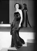 "Wienermodeschau" på Nordiska Kompaniet. Modell i hellång aftonklänning i svart satin. I bakgrunden skymtar en till modell.