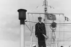 Signalering med signallampa för trafikledning. Trafikledare Erik Olsson i trafikledartornet på F 3 Östgöta flygflottilj, 1946.
