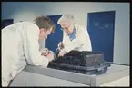 Konservatorer arbetar på konserveringsanläggningen på Beckholmen, med en sjömanskista som hittades ombord på Vasa. I mitten med pipa, arkeolog Per Lundström.