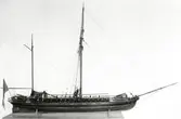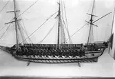 Bilden visar en modell av skärgårdsfregatten Styrbjörn från styrbordsidan.
