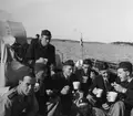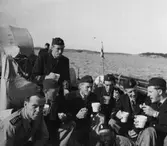 Waxholmsbolagets "provianteringsodyssé". Provianteringsbåten Waxholm I anländer till de skärgårdsbor som är värst utsatta för matbristen. Män lastar matpaket.