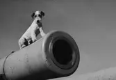 Foxterriern Nicke, skeppshund på pansarskeppet Drottning Victoria, sitter på ett kanonrör