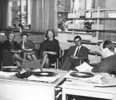Blind pojke, 11 juni 1966 En liten blind pojke i tioårsåldern klädd i randig T-shirt sitter framför en skivspelare och trycker på en av dess knappar. Han spelar en skiva som ligger på skivspelaren. Bredvid honom står en äldre man i ljus kostym och glasögon.